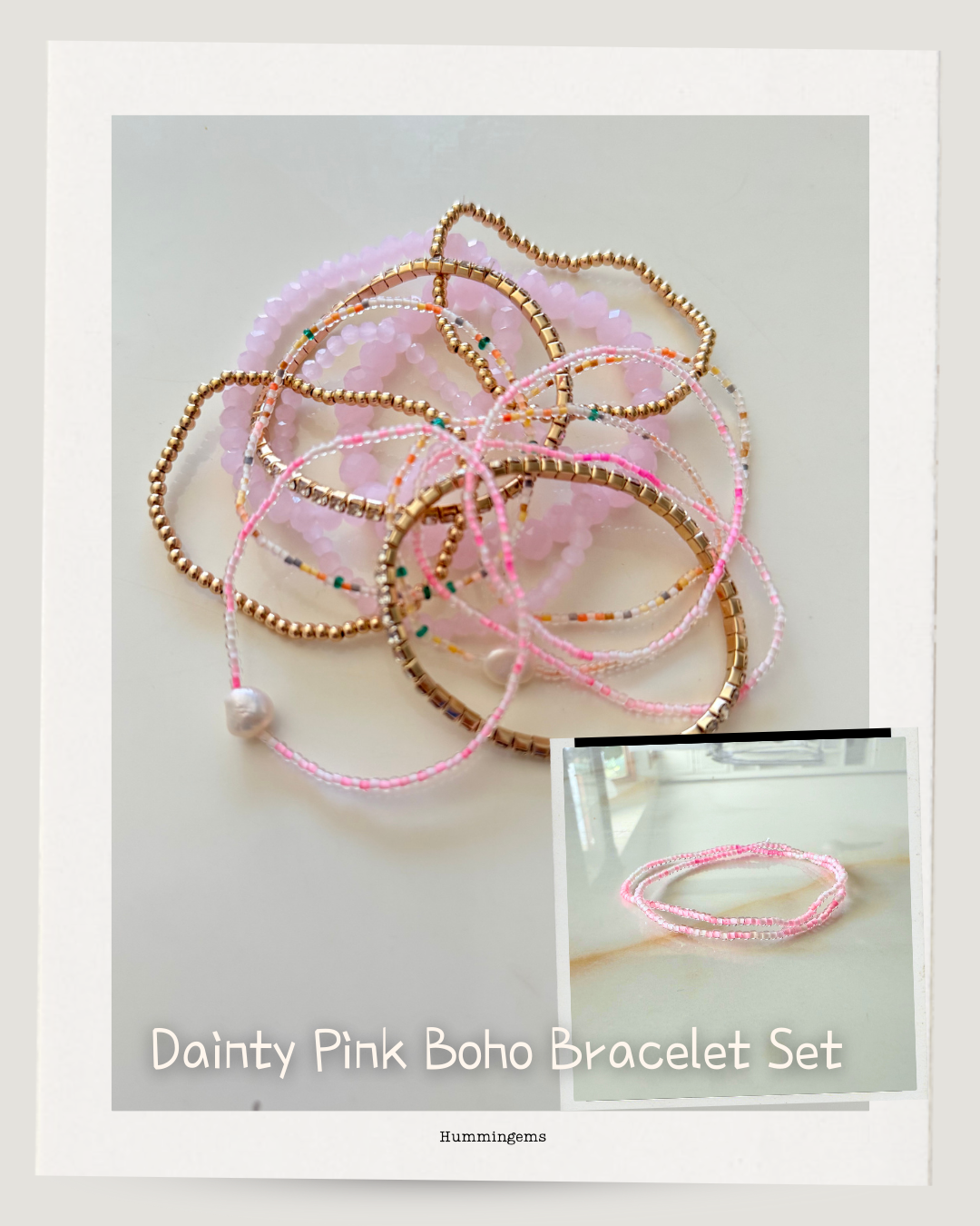 Dainty Pink Boho Bracelet Set comes with 2 beaded pink colored elastic bracelets, 1 rhinestone...