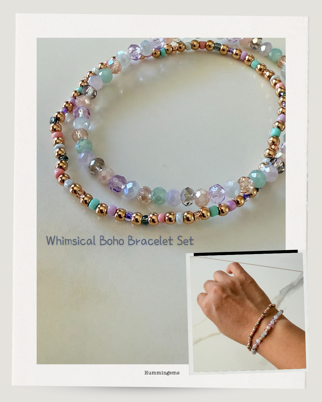 This Whimsical Boho Bracelet Set includes two elastic bracelets—one featuring gold beaded accents and the...