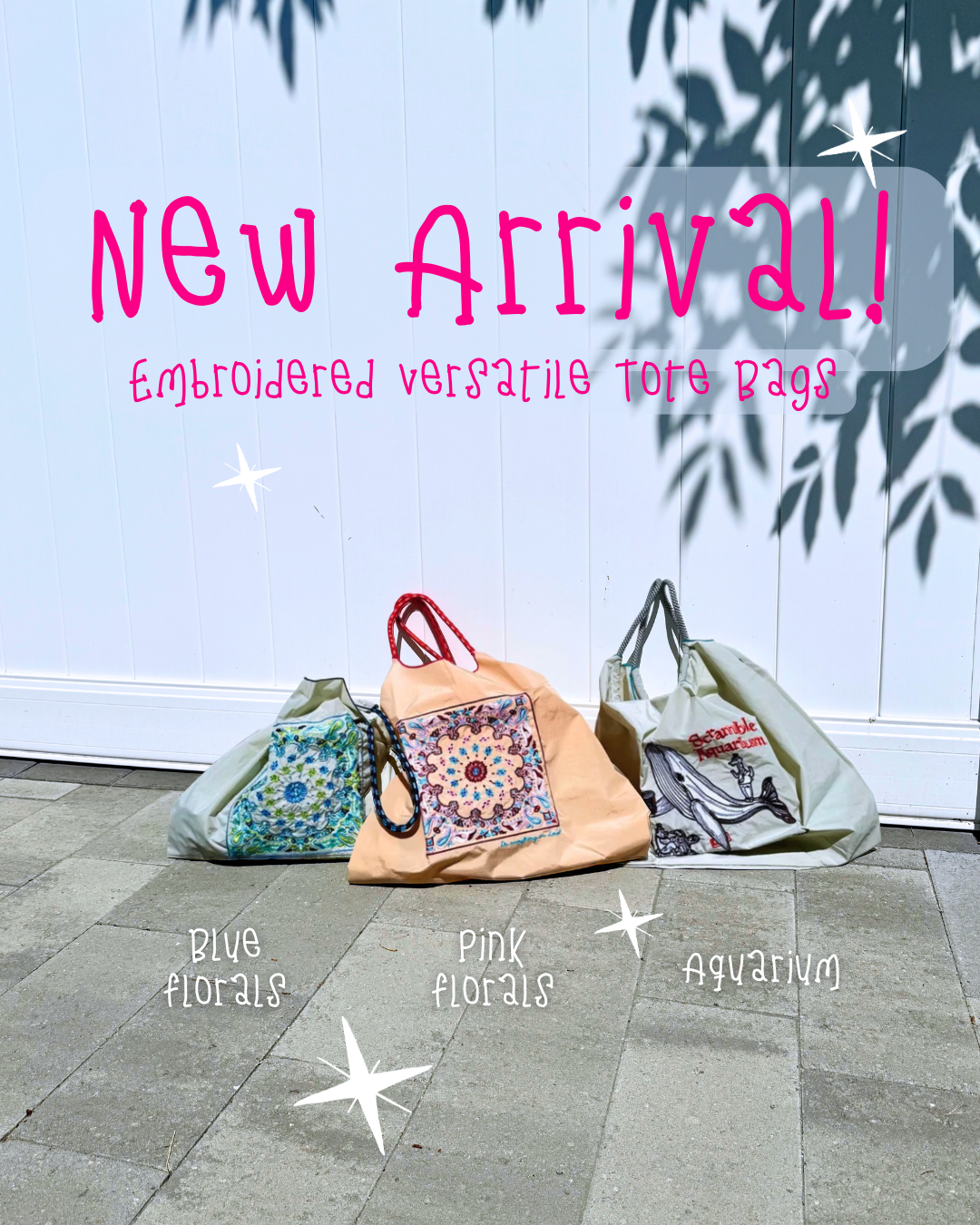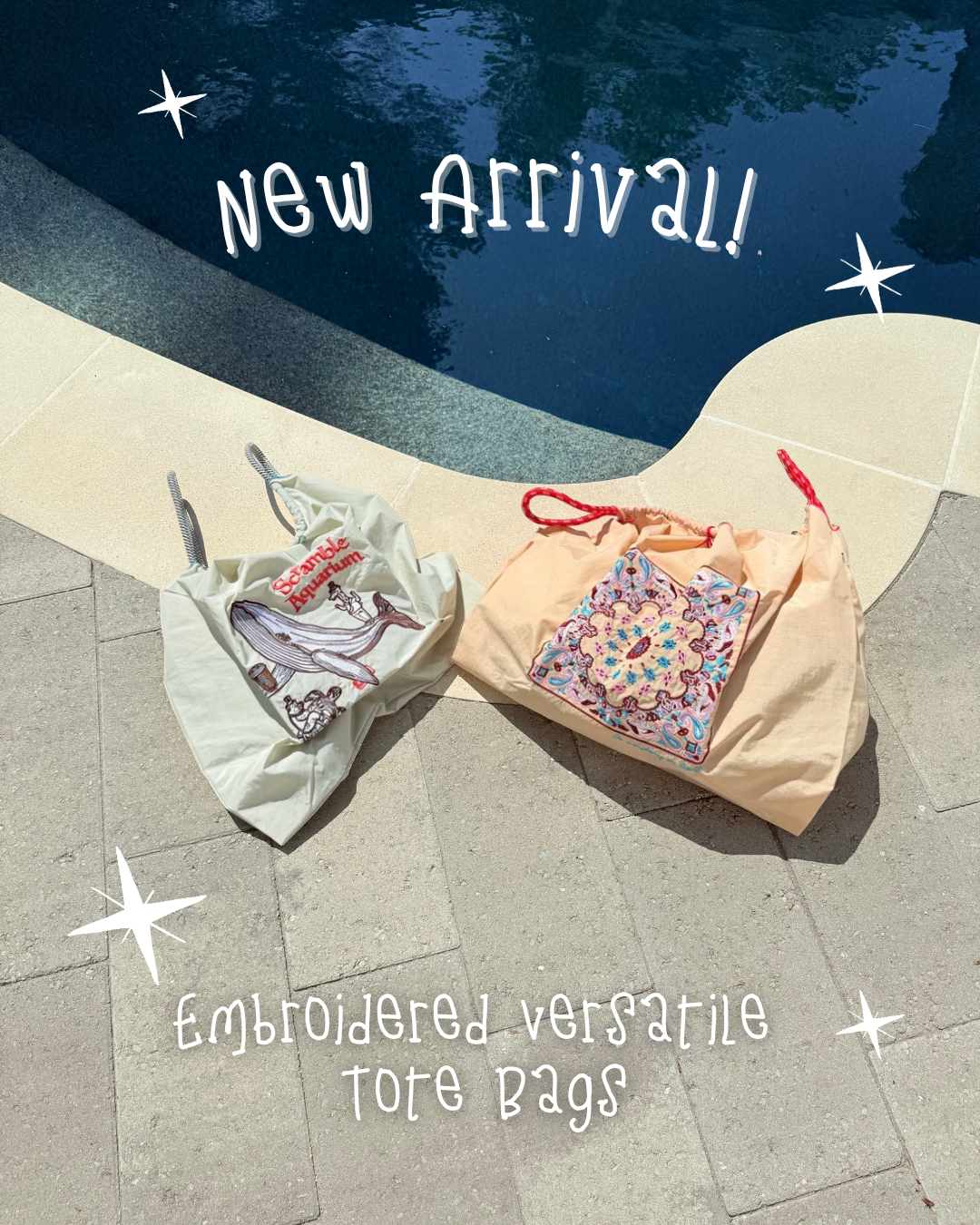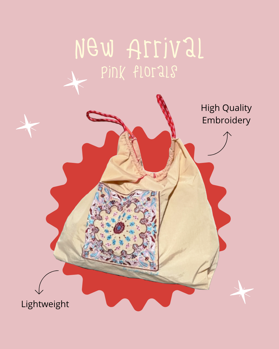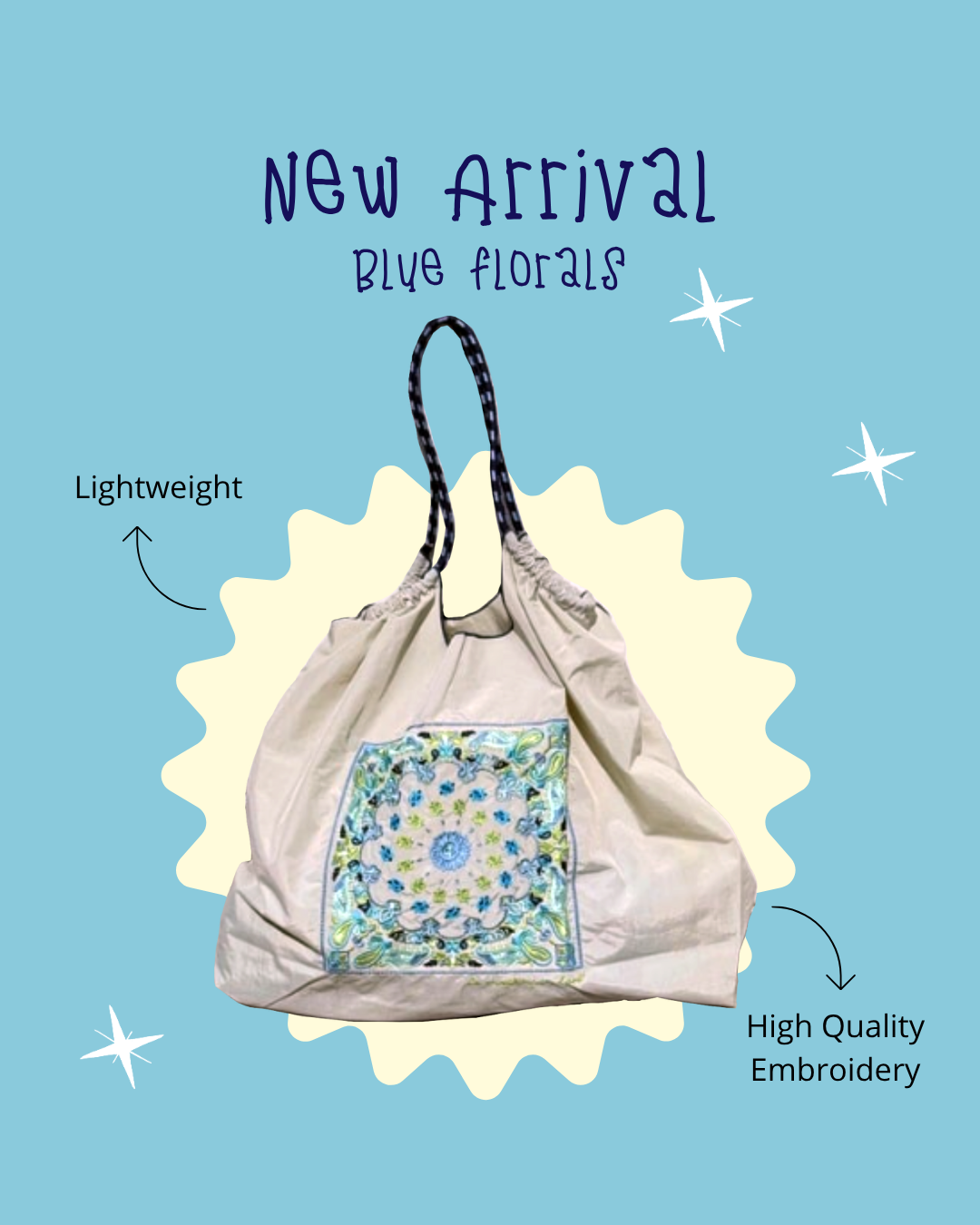 A spacious versatile tote featuring nylon fabrication dressed up with embroidered florals or whale and drawcord closure for a unique touch.