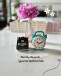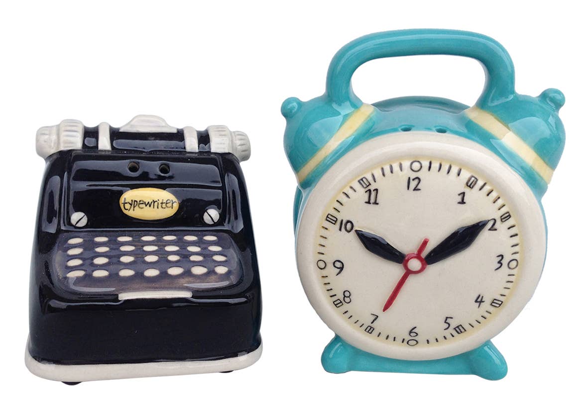Discover our Typewriter and Clock Salt and Pepper Set from Blue Sky Clayworks. This delightful duo transforms your dining experience with its playful charm and distinctive character. Crafted with inspiration from Heather Goldmine's artistic vision, these handmade ceramic pieces elevate your kitchen décor while showcasing our dedication to quality craftsmanship. Bring home the same exceptional artistry that collectors worldwide treasure that makes seasoning your meals a truly unique experience.